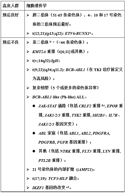 ● 建议通过高通量测序 (NGS) 对融合基因和致病突变进行全面检测,特别是已知BCR-ABL1/ Ph阴性或Ph-like时。[Ph-like表型与反复发生的能够激活酪氨酸激酶途径的融合基因和突变有关,包括涉及ABL1、ABL2、CRLF2、CSF1R、EPOR、JAK2或PDGFRB的融合基因,以及涉及FLT3、IL7R、SH2B3、JAK1、JAK3和JAK2(伴随CRLF2融合基因)的突变。在诊断时检查这些异常可能有助于危险分层。靶向药物在该类人群中的安全性和有效性是研究热点。在亚二倍体ALL的情况下,生殖系TP53突变常见,应考虑检测。]