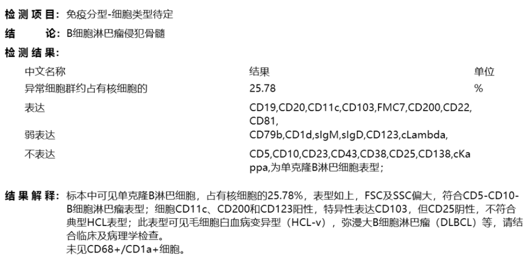 B细胞淋巴瘤,结合形态学表现,考虑变异型毛细胞白血病可能性大。