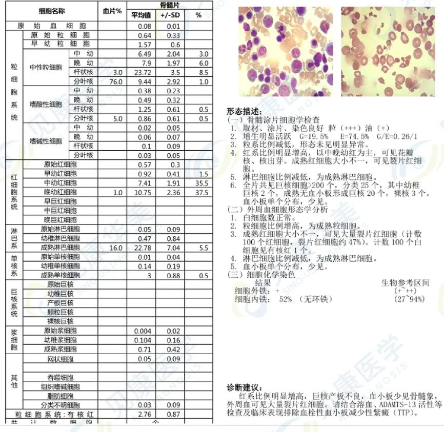 高度怀疑血栓性血小板减少性紫癜(TTP),建议结合溶血、ADAMTS-13活性检查进一步明确。