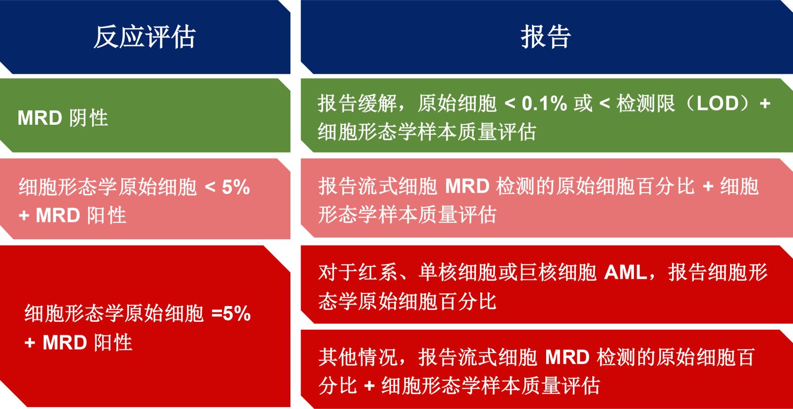①AML 反应评估中,推荐采用流式细胞学 MRD 检测方法进行原始细胞计数。
