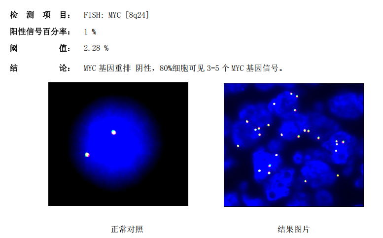 如图,在MYC分离探针中,正常信号为2个红绿叠加(黄色)信号,红绿信号分离提示MYC基因分离。