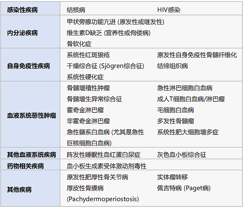 骨髓纤维化是网状纤维和/或胶原纤维异常增生并替代正常造血组织的病理状态,并非独立疾病,而是多种血液系统及非血液系统疾病的共同表现(表1)。可分为原发性(属骨髓增殖性肿瘤)和继发性(继发于血液肿瘤、感染、炎症、自身免疫病、内分泌代谢障碍或实体瘤等)。