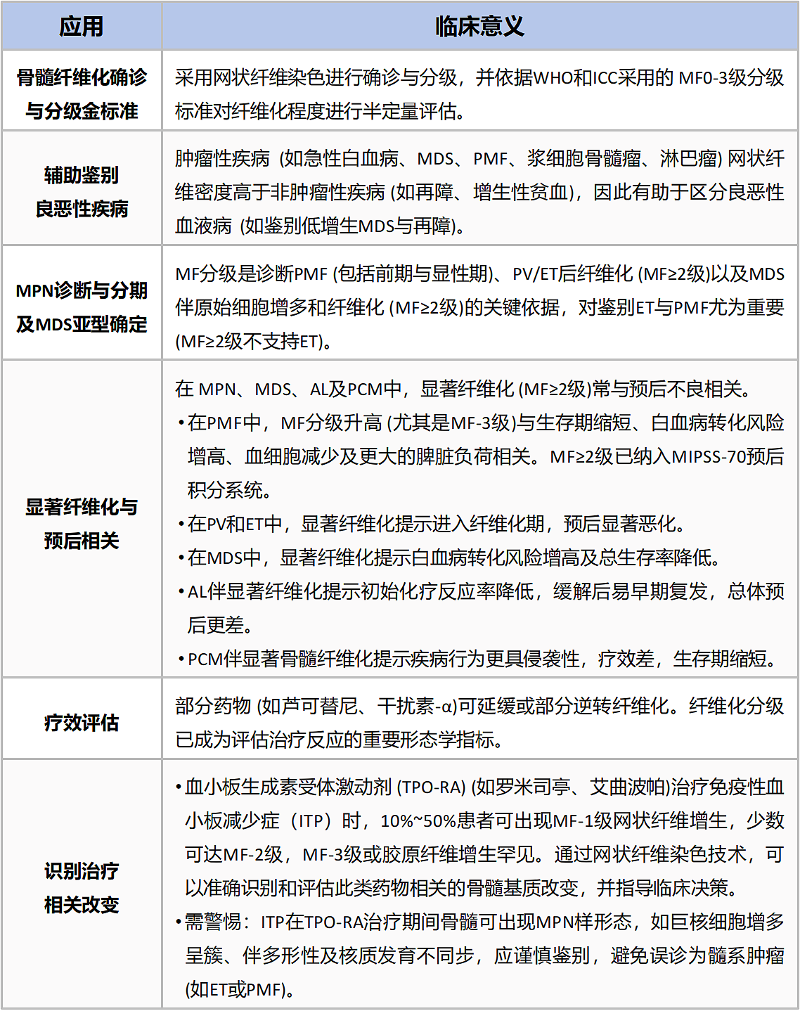 骨髓纤维化的评估主要基于网状纤维染色。世界卫生组织(WHO)和国际共识分类(ICC)采用四级分类的MF分级标准(表2),依据网状纤维密度进行半定量评估,该分级结果与临床结局高度相关,不仅可作为包括原发性骨髓纤维化(PMF)在内的骨髓增殖性肿瘤(MPN)的重要诊断依据,也用于评估疾病阶段、判断预后及监测治疗反应。
