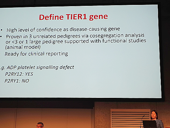 在此报告中,鲁汶大学的Kathleen Freson副教授介绍了16个Tier-1致病基因:ABCG5、ABCG8、ADAMTS13、AP3D1、COL1A1、COL5A1、COL5A2、FYB、KNG1、MPIG6B、PTPN11、RNU4ATAC、SLFN14、TPM4、ARPC1B、F12,其中有最近发现的SLFN4基因突变可导致血小板型20(BDPLT20);ARPC1B基因突变可导致血小板减少伴免疫缺陷;TPM4基因突变可导致巨大血小板减少,而且后者尚未在OMIM数据库中更新。