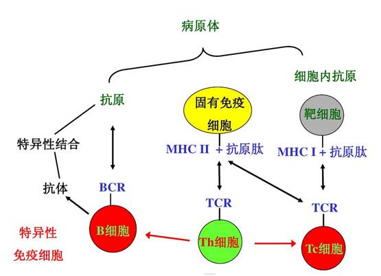 ▲△HLAⅠ类分子广泛分布于有核细胞表面(而成熟的红细胞、神经细胞及滋养层细胞不表达),与Tc细胞(细胞毒性T细胞)表面CD8分子结合,呈递内源性抗原。HLAⅡ类分子分布于抗原提呈细胞(单核/巨噬细胞,成熟B细胞,树突状细胞)和活化T细胞表面,与Th细胞(辅助性T细胞)表面CD4分子结合,呈递外源性抗原。