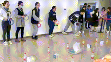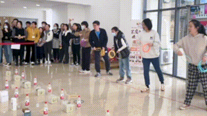 活动一开始,女同事们就纷纷安抽签顺位依次排队,每六人为一组,套圈分两侧同时进行。