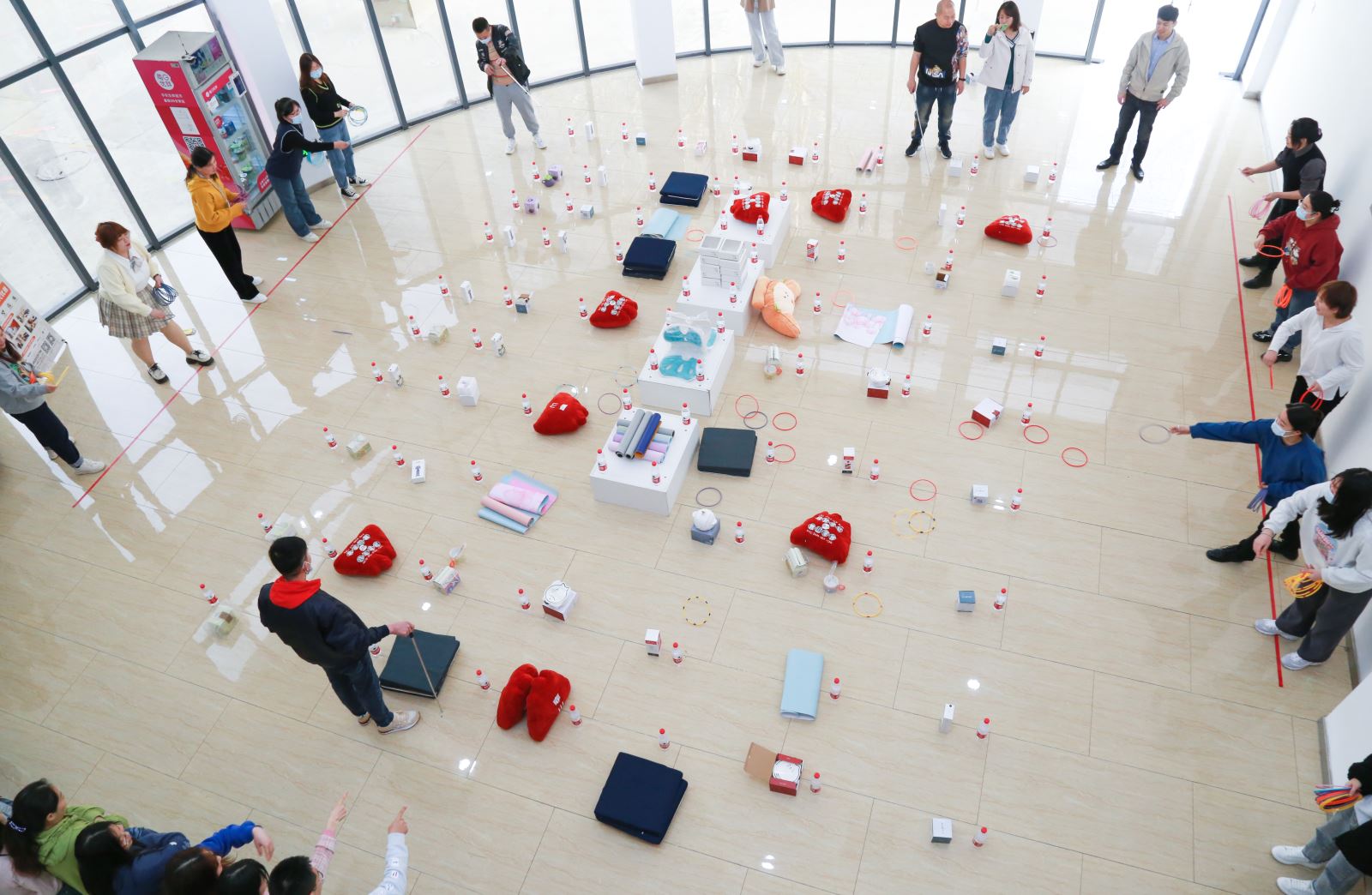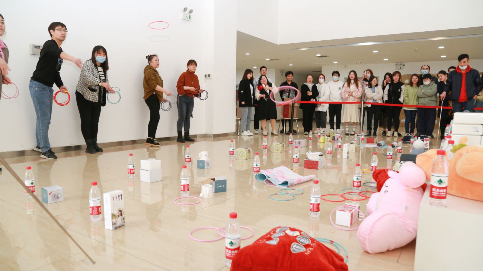 按照游戏规则,套中的纪念品即归个人所有。活动中大家拼运气,比技巧,现场充满欢声笑语。丰富的礼品吸引了女同事们的广泛参与,大家纷纷使出浑身解数,套圈方法层出不穷,小小的套圈满场纷飞。