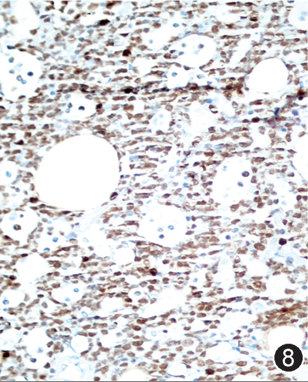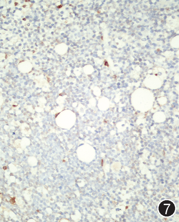 图注:图1 骨髓涂片中的肿瘤细胞(瑞氏染色,×1 000);图2 骨髓活检中的肿瘤细胞(HE, 高倍放大);图3 免疫组织化学染色,CD20部分阳性(EnVision法,中倍放大);图4 免疫组织化学染色,CD19阳性;图5 免疫组织化学染色,CD10阳性;图 6 免疫组织化学染色,MYC阳性,图 7 免疫组织化学染色,bcl-2阴性;图 8 免疫组织化学染色,Ki-67阳性指数约 80%。