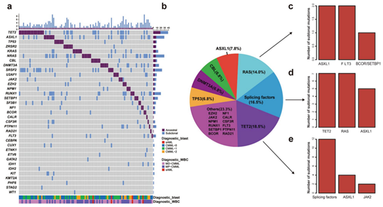 在102例克隆分析患者中,主克隆事件优先发生在TET2(18.5%)、剪接因子(16.5%)、RAS(14.0%)和ASXL1(7.8%),而亚克隆突变则主要是ASXL1、TET2和RAS。(如图2所示)