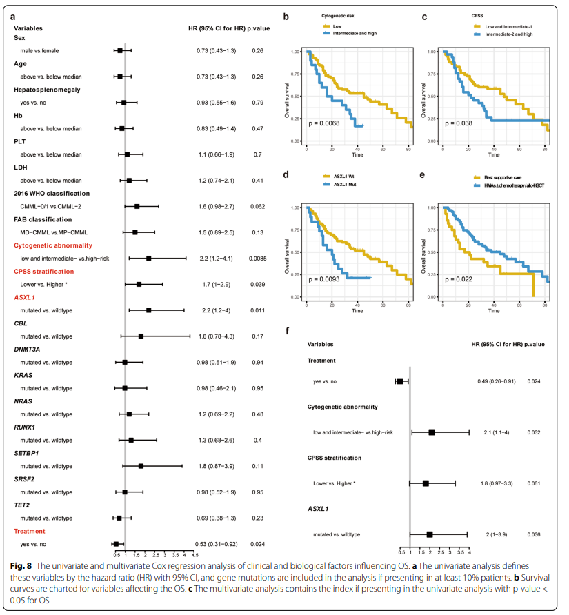 单变量分析发现ASXL1突变、中高危细胞遗传学异常、CMML特异性预后评分系统(CPSS)分层(CMML-2组和高危组)和治疗方案(最佳支持治疗)可预测预后不良的OS。多变量分析显示了类似的结果。(如图4所示)