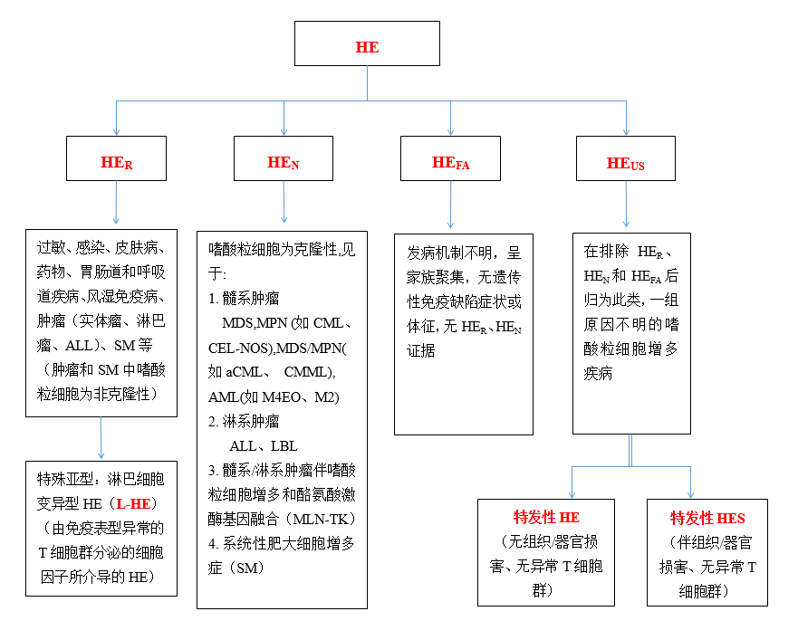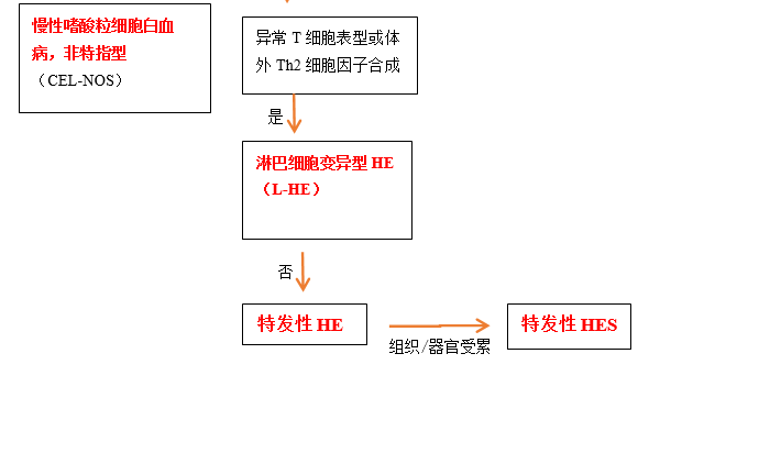 ③高嗜酸粒细胞综合征(HES):满足HE的诊断标准并伴有由于嗜酸粒细胞浸润、活化或脱颗粒引起的组织/器官功能损害。