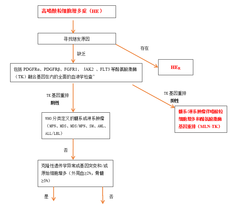 综上所述,对于外周血嗜酸粒细胞增多,尤其是>1.5×109/L的患者,若无明确的继发原因,应排除包括CEL在内的克隆性HE,通过全面的血液学检查进行归类以确定后续治疗。