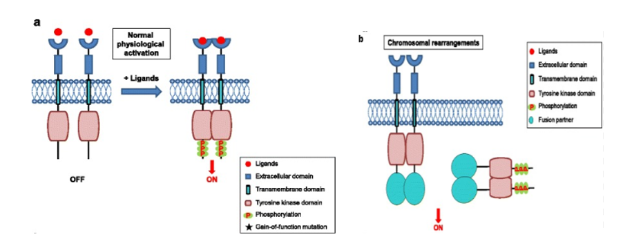 b.基因重排导致异常融合蛋白形成。RTK融合蛋白可以是膜结合(图左)或细胞质结合(图右),由基因断点的位置决定。无论哪种情况,均可在无配体的情况下持续激活。
