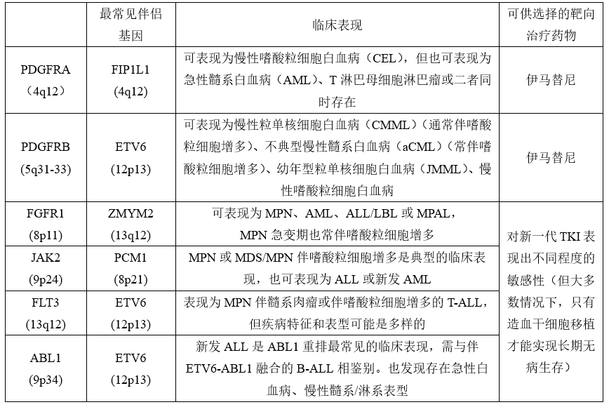 伴不同TK融合基因及嗜酸粒细胞增多的髓系/淋系肿瘤虽有着不同的伴侣基因及临床表现,但均对酪氨酸激酶抑制剂(TKI)敏感。