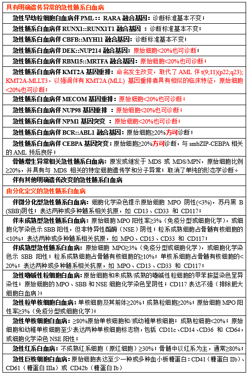 * 大多数具有明确遗传异常的AML可在原始细胞<20%时进行诊断。