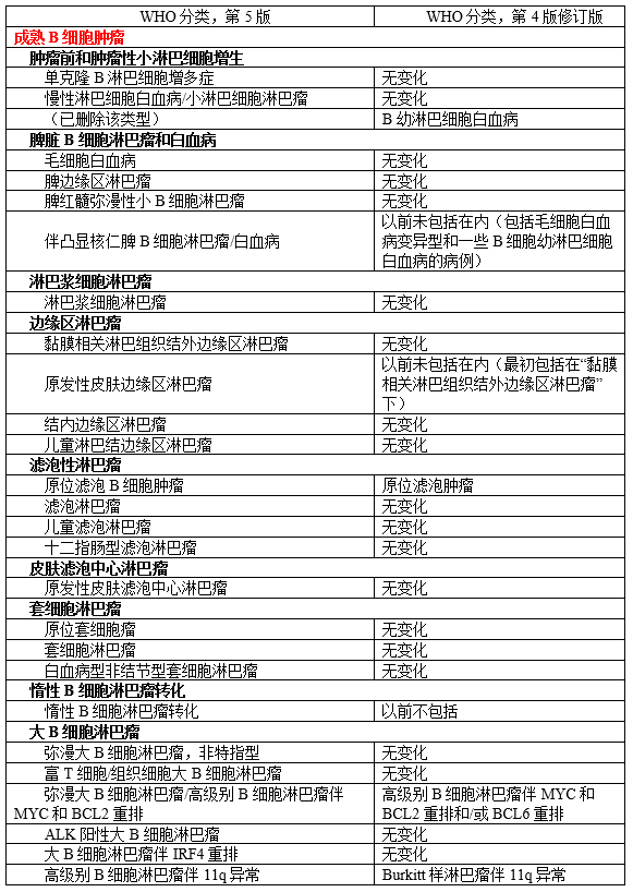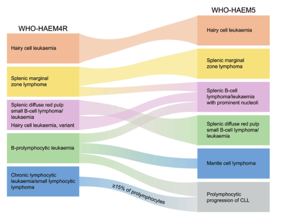 克隆性B细胞增多症(monoclonal B-cell lymphocytosis,MBL)和慢性淋巴细胞白血病/小淋巴细胞淋巴瘤(CLL/SLL)保持不变,而B-幼淋巴细胞白血病(B-PLL)不再作为一个独立类型。