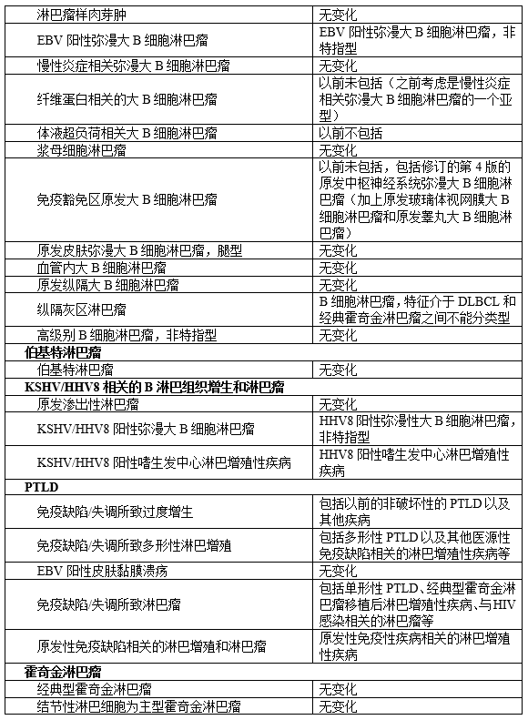 表1. WHO造血及淋巴肿瘤分类,B细胞淋巴样增生和淋巴瘤-第5版相较于第4版修订版的变化(2)