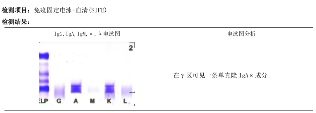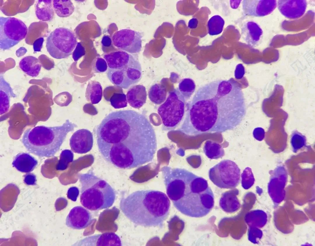 骨髓浆细胞33%,胞体大,可见花瓣核等不规则核浆细胞。外周血未见浆细胞。