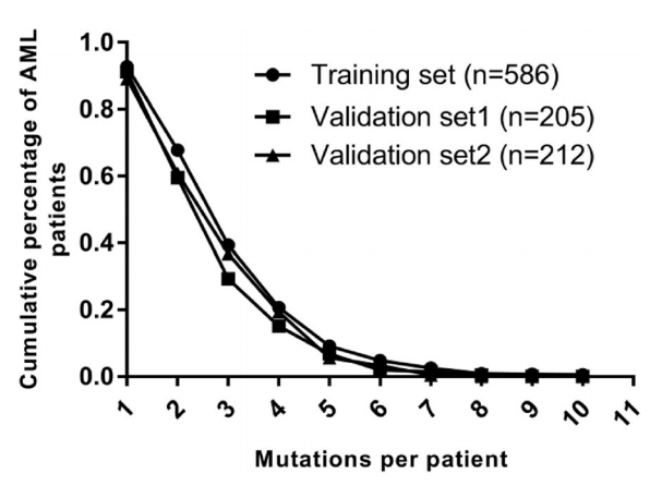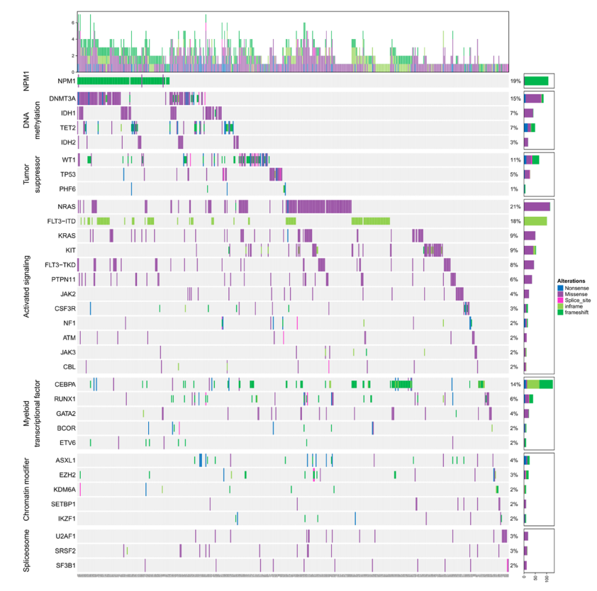 本研究纳入了1003例初诊和治疗后AML患者的NGS数据,基因突变图谱(图1)显示中国人群AML患者的NPM1和FLT3-ITD突变发生率要低于西方患者,然而KRAS突变发生率却更高。
