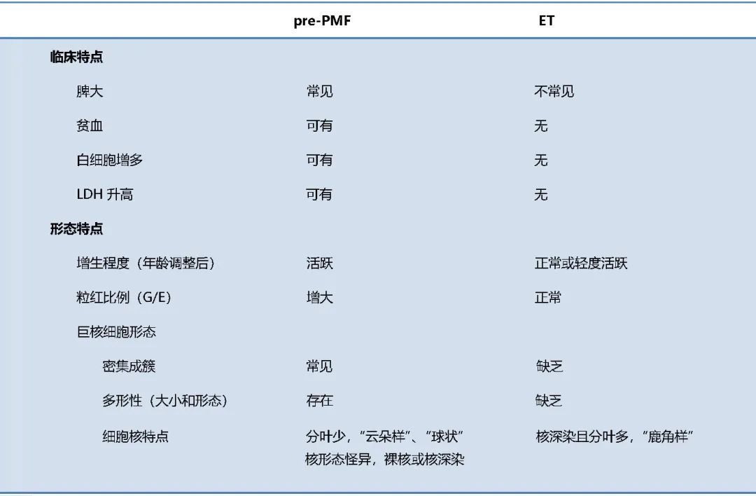 表2.原发性骨髓性纤维化-纤维化前期(pre-PMF)与原发性血小板增多症(ET)的鉴别