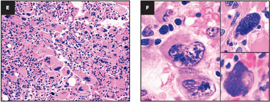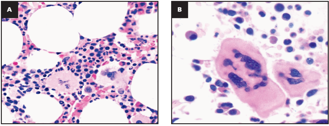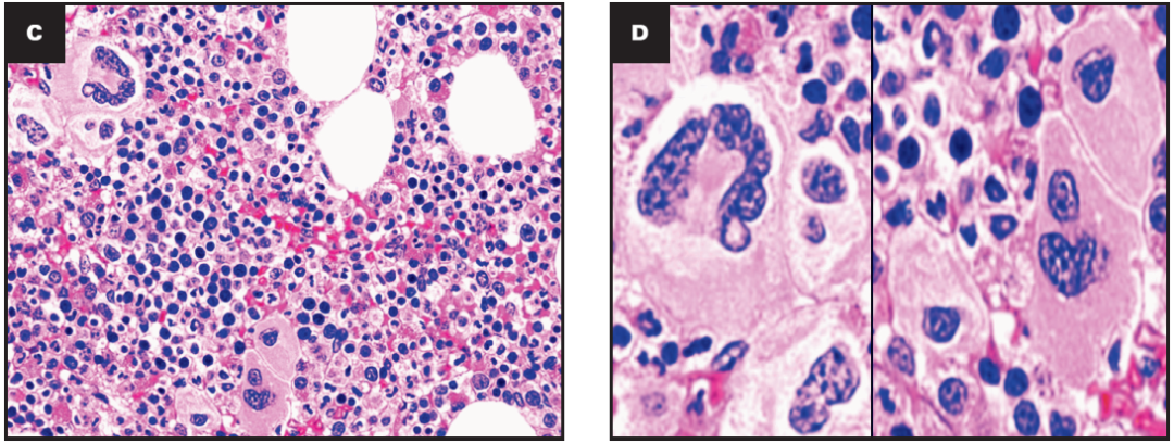 PMF:巨核细胞密集成簇,核异型,分叶少,呈“云朵样”与“奇异核”,并见裸核及核深染。