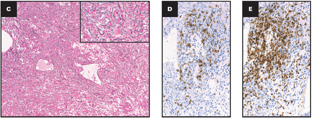 2、免疫组化CD20和CD3染色示淋巴细胞聚集灶中B和T细胞混合,以T细胞为主。