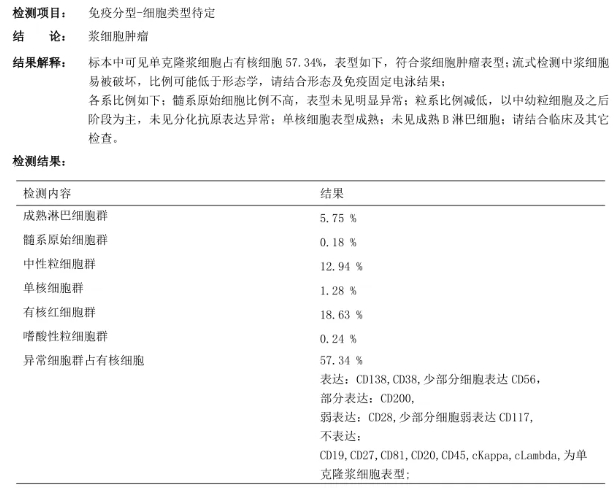 (备注:形态学因浆细胞不典型,偏位不明显,部分细胞划到淋巴细胞中,致浆细胞比例较流式少)