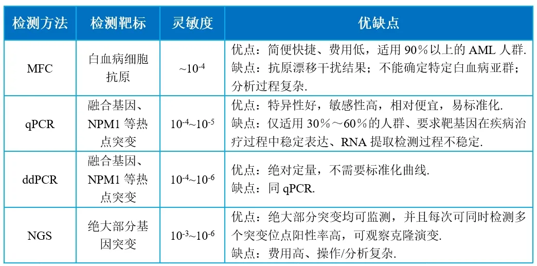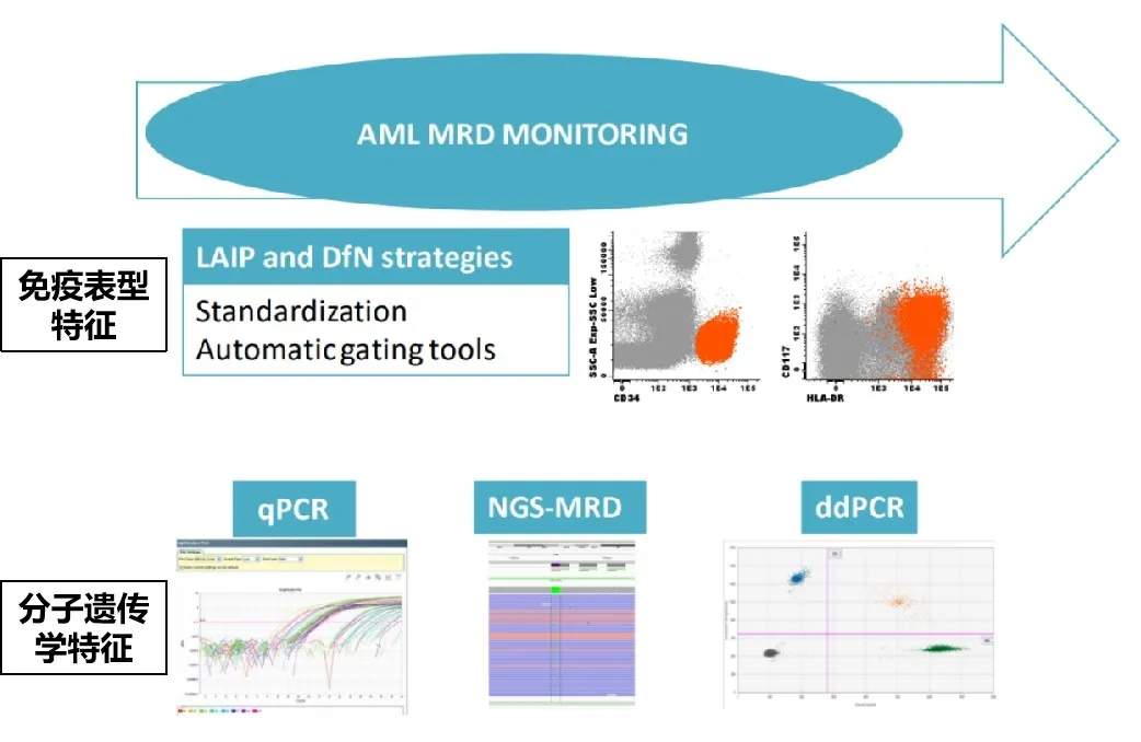 AML患者的MRD检测方法包括多参数流式细胞术(MFC)、实时定量聚合酶链反应(qPCR)、微滴式数字PCR(ddPCR)和二代测序技术(NGS)等。