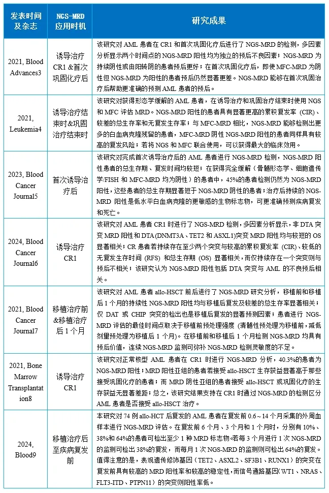 近些年已有多项使用NGS技术对AML患者进行MRD检测的研究发表,总结这些文章的研究成果可以发现3-9:
