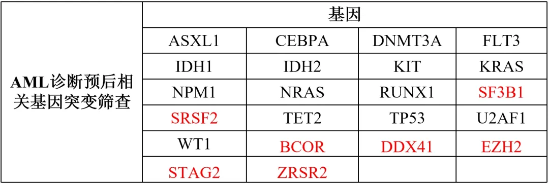 由12基因升级为25个基因,新增13个基因:CEBPA、FLT3、NPM1、RUNX1、WT1、BCOR、CBL、EZH2、GATA2、STAG2、STAT3、ZRSR2、UBA1