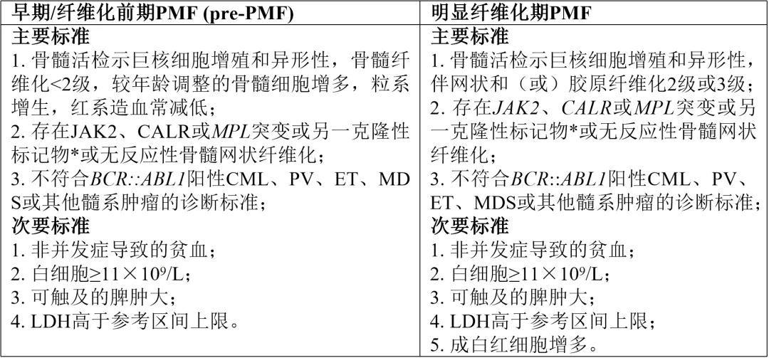 表4. ICC的早期/纤维化前和明显原发性骨髓纤维化 (PMF) 的诊断标准