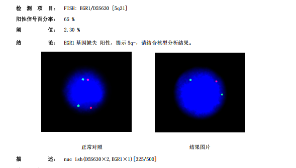 如图,5q-探针中,正常是2绿2红,2绿1红提示5号染色体长臂缺失(5q-),1绿1红提示整条5号染色体缺失(-5)。
