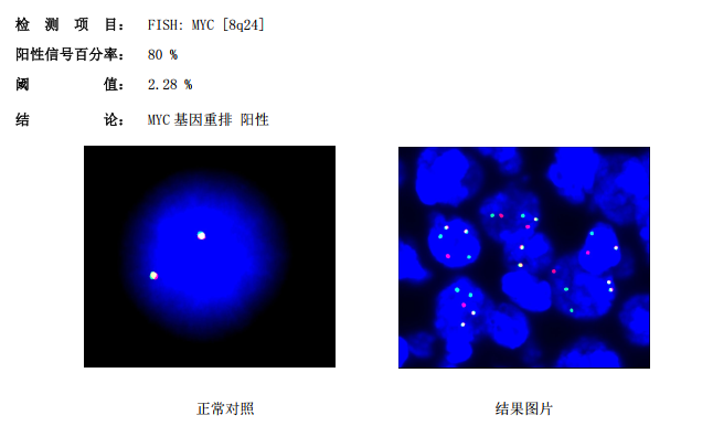 如图,在MYC分离探针中,正常信号为2个红绿叠加(黄色)信号,红绿信号分离提示MYC基因分离。