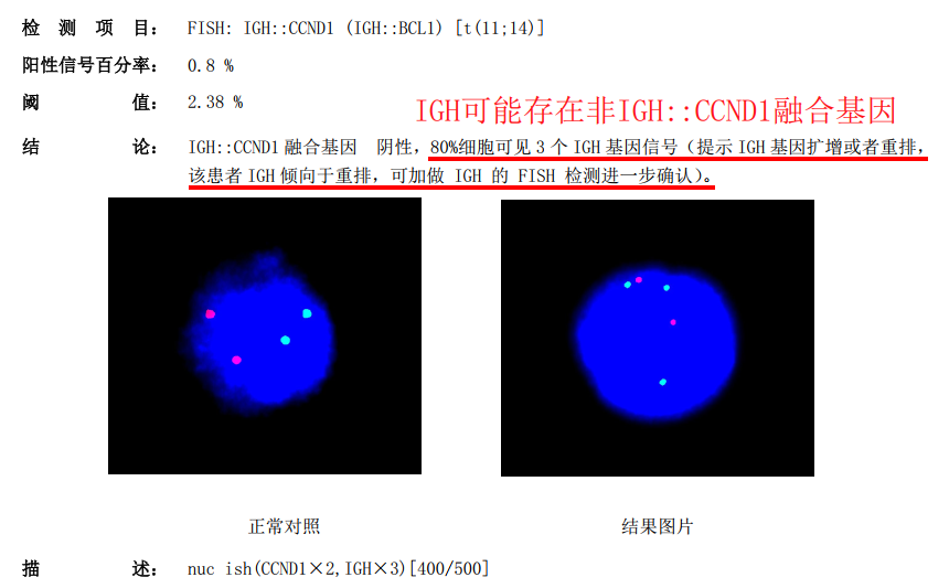 如图,IGH::CCND1探针,左图正常信号为2红2绿,右图存在3个IGH基因(绿色)信号,提示IGH可能与非CCND1伙伴基因发生融合。