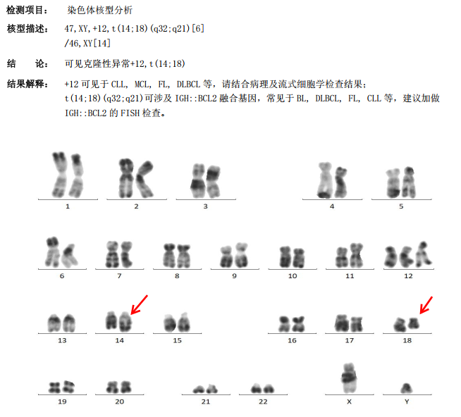 该患者染色体结果显示t(14;18)(q32;q21),结合患者CLL病史,提示为IGH::BCL2融合基因。