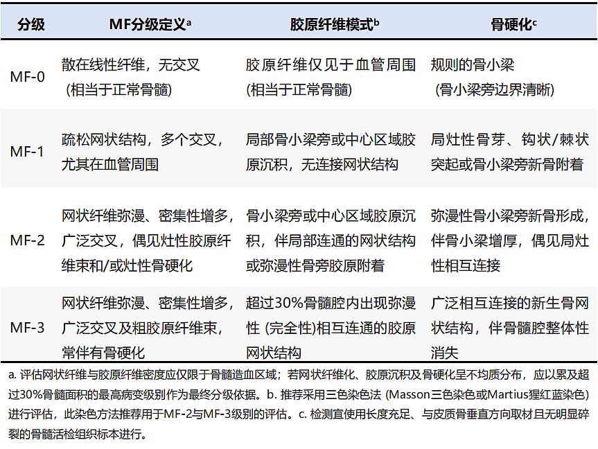 表2 骨髓纤维化(MF)、胶原纤维化和骨硬化分级(2024 WHO)