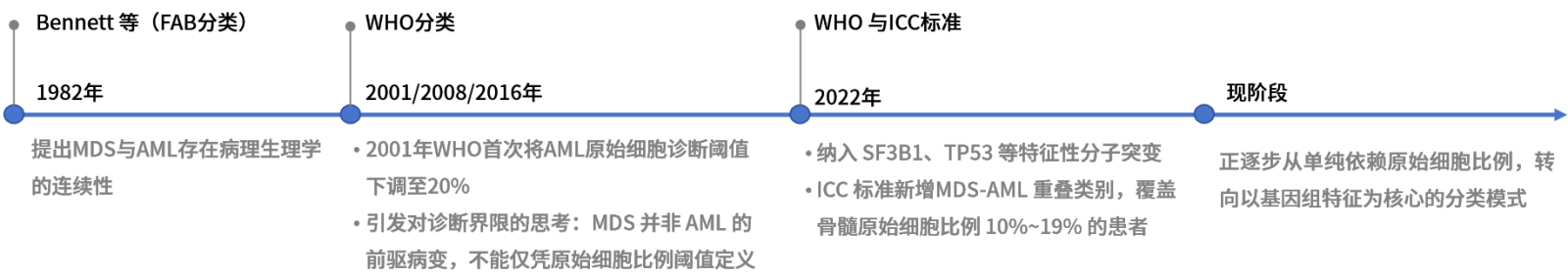 长期以来,MDS被认为在病理生理上与AML存在连续性。2001年WHO分类标准将AML的诊断阈值调至20%,这一调整在此后引发了关于疾病诊断界限的诸多思考:MDS绝非仅是AML的前驱病变,更不能仅凭人为设定的原始细胞比例阈值来定义。