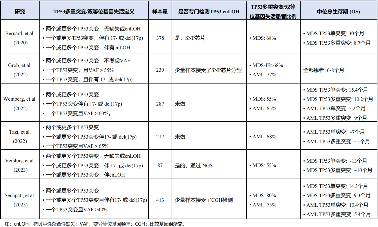 在MDS中,TP53多重突变患者预后较差,中位生存期仅6-12个月;而单突变患者的中位生存差异较大(7-30个月),主要源于识别cnLOH的方法不同(表1)。