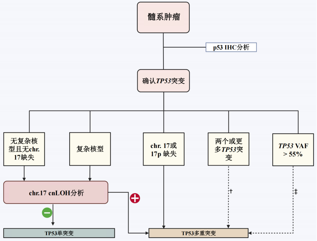 在TP53突变型髓系恶性肿瘤中,精准明确TP53突变等位基因状态至关重要。本文建立了一套临床适用的诊断流程,通过NGS panel测序与细胞遗传学检测,可识别出多数TP53多重突变患者。针对聚焦此类疾病的临床研究,建议联合检验中心,进一步精确分析TP53 cnLOH 状态。