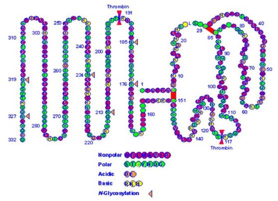 人的TPO蛋白前体N端为21个氨基酸残基组成的信号肽,经水解后形成332个氨基酸残基组成的成熟TPO蛋白,分子量约为38kD。成熟的TPO蛋白含两个完全不同的结构域。一个是153个氨基酸残基组成的氨基末端结构域,与EPO同源(20%相同,还有25%相似),具高度保守性。与EPO一样,TPO在此区中也含有4个Cys,其中3个具有保守性,第一个和最后一个Cys组成一个二硫键,是维持TPO和EPO生物活性所必需的。对全长人TPO蛋白与仅由N端153个氨基酸残基组成的多肽进行生物活性对比,发现两者具有相似的生物活性,表明TPO蛋白的生物活性主要由其N端结构域决定。另一个结构域是178个氨基酸残基组成的羧基末端结构域,富含Ser、Thr和Pro,并具有6个潜在的糖基化位点,此区具有广泛的种属特异性,此区的功能与稳定和增加循环中的TPO的半衰期有关。