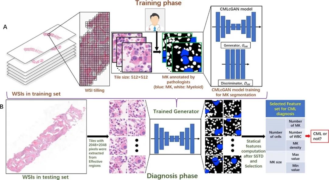 Figure 1. The framework of the automatic diagnosis of CML. A. The procedure of CMLcGAN training included end-to-end data set construction and model training; B. The pipeline of the whole diagnostic process. The extraction of clinical features was based on the segmentation results of the trained CMLcGAN. The trained generator generated the segmentation results, and the training of the discriminator was only to supervise the generator's training. Since the effective diagnostic regions of each WSI were different due to the production of slices, SSTD was used to eliminate the difference in statistical features extracted among various cases.