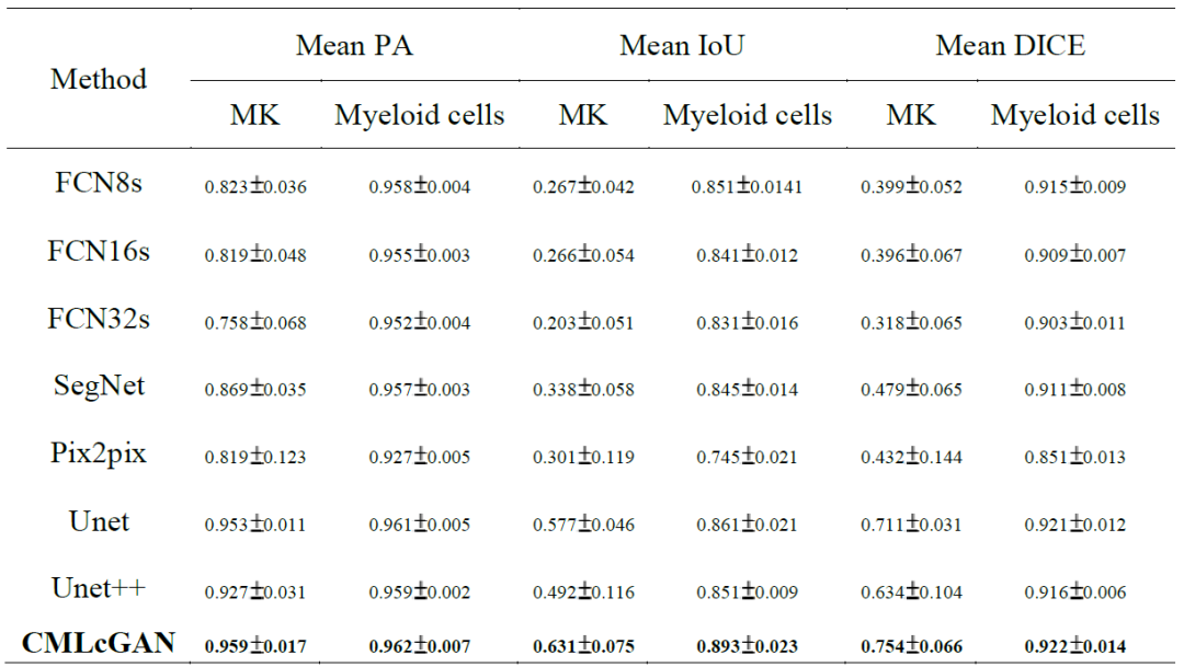 本团队开发的CMLcGAN模型,用于从骨髓活检图像中分割巨核细胞。选取517幅骨髓活检图像进行CMLcGAN的性能评估,其平均像素精度(PA)为95.1%,平均交并比(IoU)为71.2%,平均Dice系数(DICE)为81.8%。同时,将CMLcGAN与其他七种基于深度学习的分割模型进行比较(Table 1),结果表明,CMLcGAN的各项指标性能均优于其它分割模型。