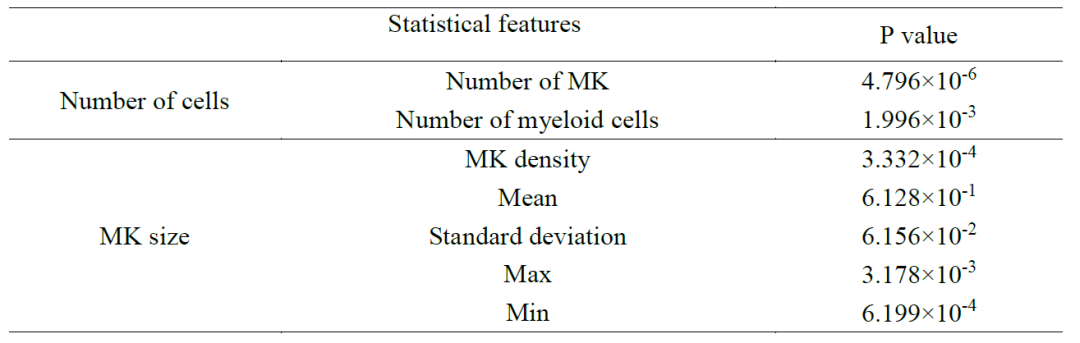在临床验证阶段,提取了骨髓细胞的七维数据特征(Table 2),采用t检验分析,最终选取具有统计学意义的五维数据特征作为临床预测特征集,用于区分CML及正常对照。