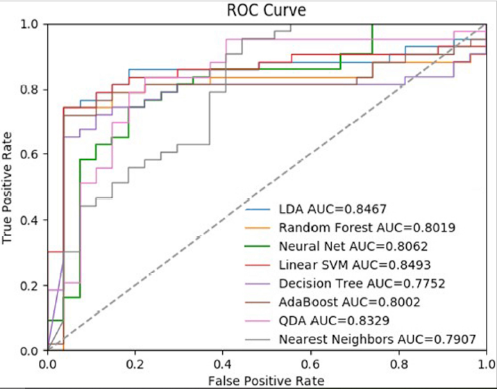 Figure 7. The ROC curve of the cross-validation result. All 8 binary classifiers showed that the extracted statistical features had diagnostic capabilities
