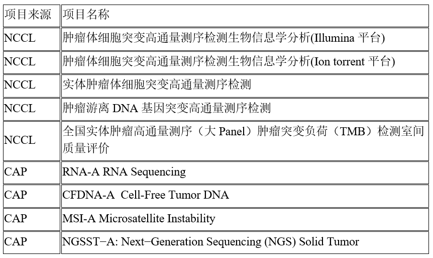室间质量评价是为实验室之间评价检测能力而进行的一种实验室间的比对,可以帮助实验室提高检验质量。见康华美实验室建立了完善的质量体系,并一直以高标准严要求开展临床检测服务,近年来顺利通过了多项NCCL和CAP的实体瘤基因检测室间质评,包括体细胞突变检测、cfDNA突变检测、MSI检测、RNA融合检测、生信分析等项目(见表1),展现了见康华美实验室的实体瘤基因检测能力。未来见康华美实验室会继续以严谨的态度为患者提供优质的精准检测服务。