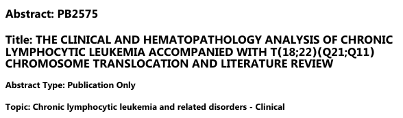t(18;22)(q21;q11)是一种罕见的染色体异位,该易位导致IGL::BCL2融合基因的形成,70%以上案例发生于CLL患者当中,也可少见于FL, DLBCL, ALL等。此类患者主要伴有的额外染色体异常为+12(44.4%)和del(13q)(11.1%),37.0%的病例表现为复杂核型(≥3独立异常)。此外,患者常伴有IGHV突变。
